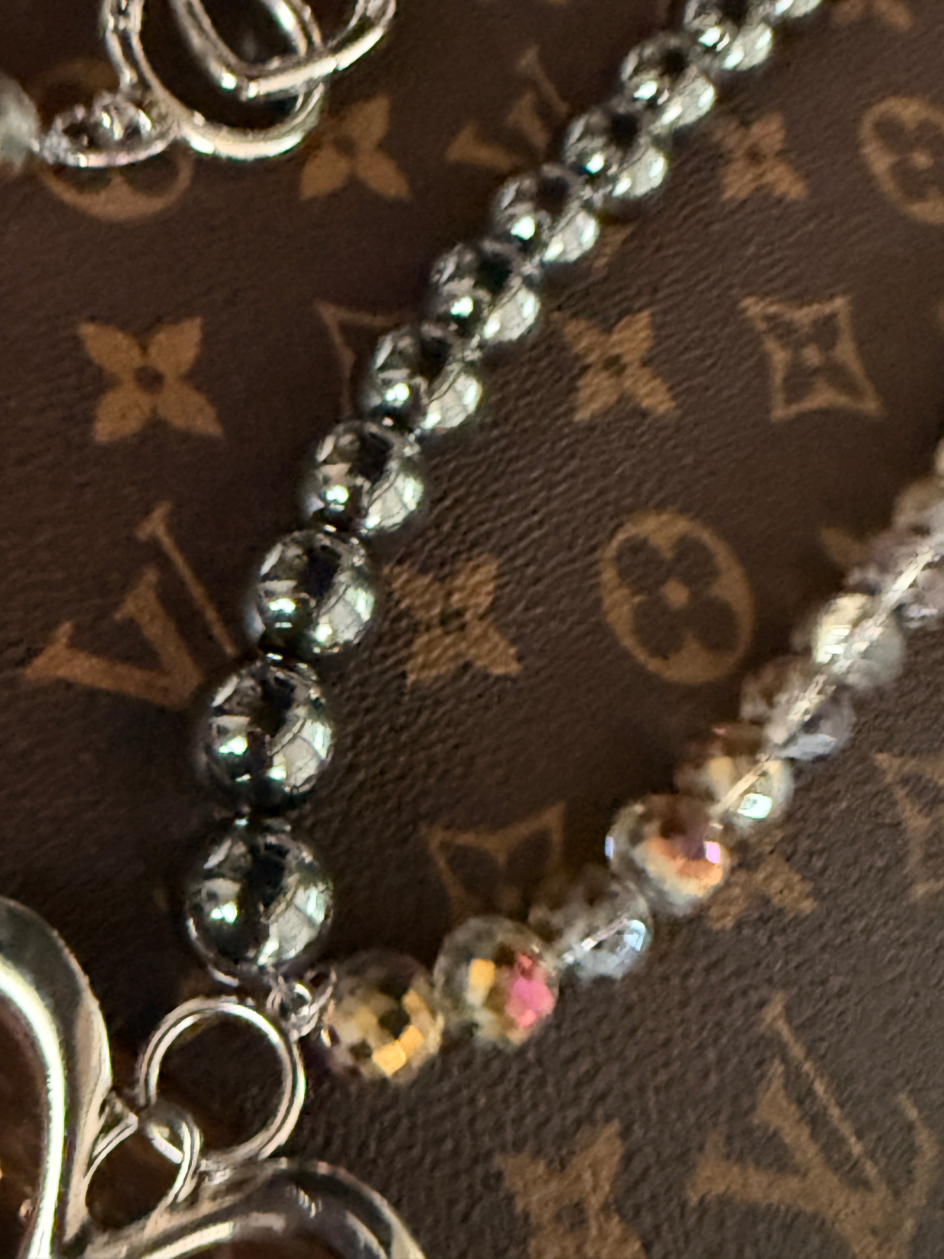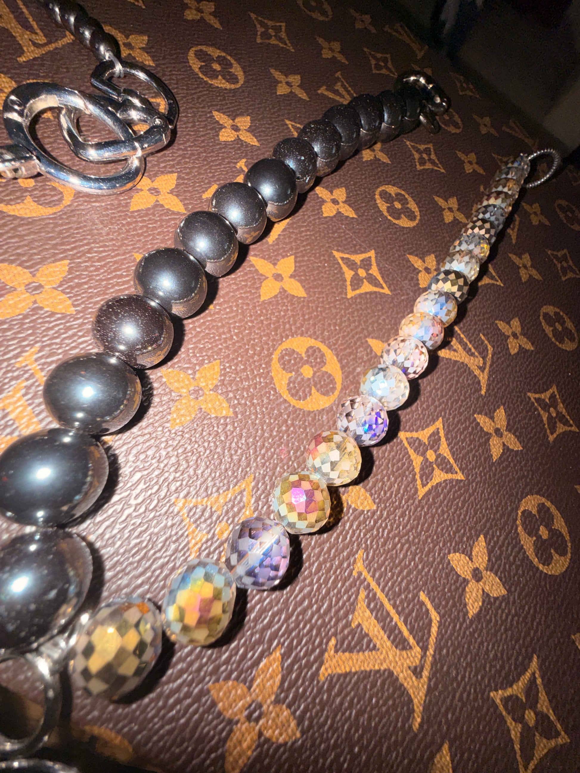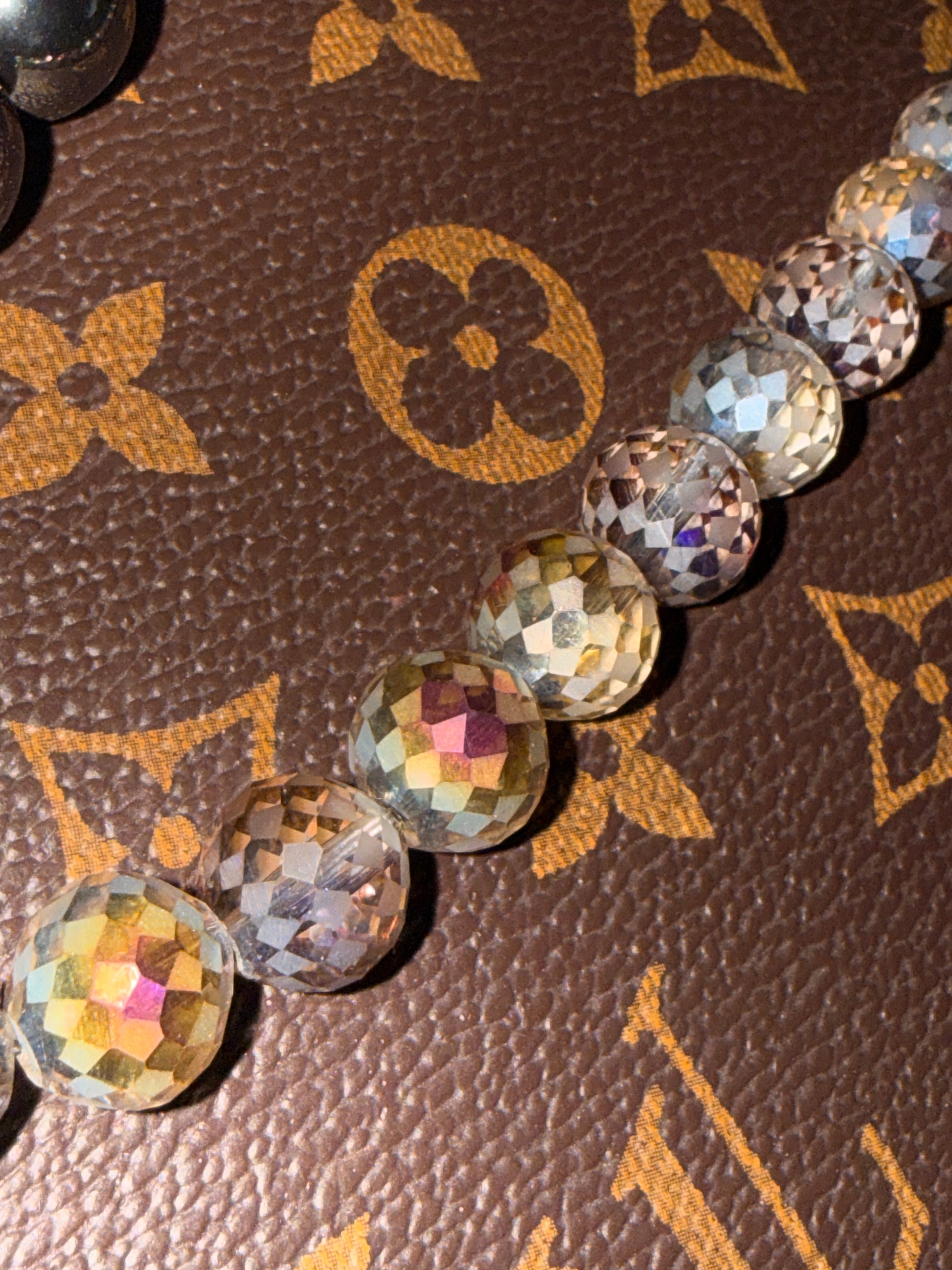This design boast a larger bead, heavy to touch but comfortable to wear. Exclusive multi colored gem cut glass beads.
